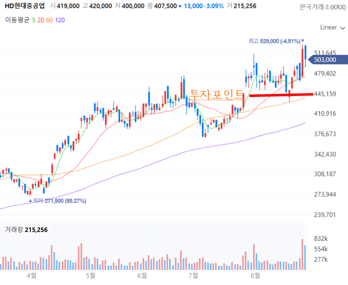 이런 상황에서 이재명 대통령과 트럼프 대통령 간의 협상이 성공적으로 이루어지자 한국의 조선업체들의 주가가 다시 서서히 기지개를 펴는 모습을 보여주고 있는 것이라 할 수 있습니다.