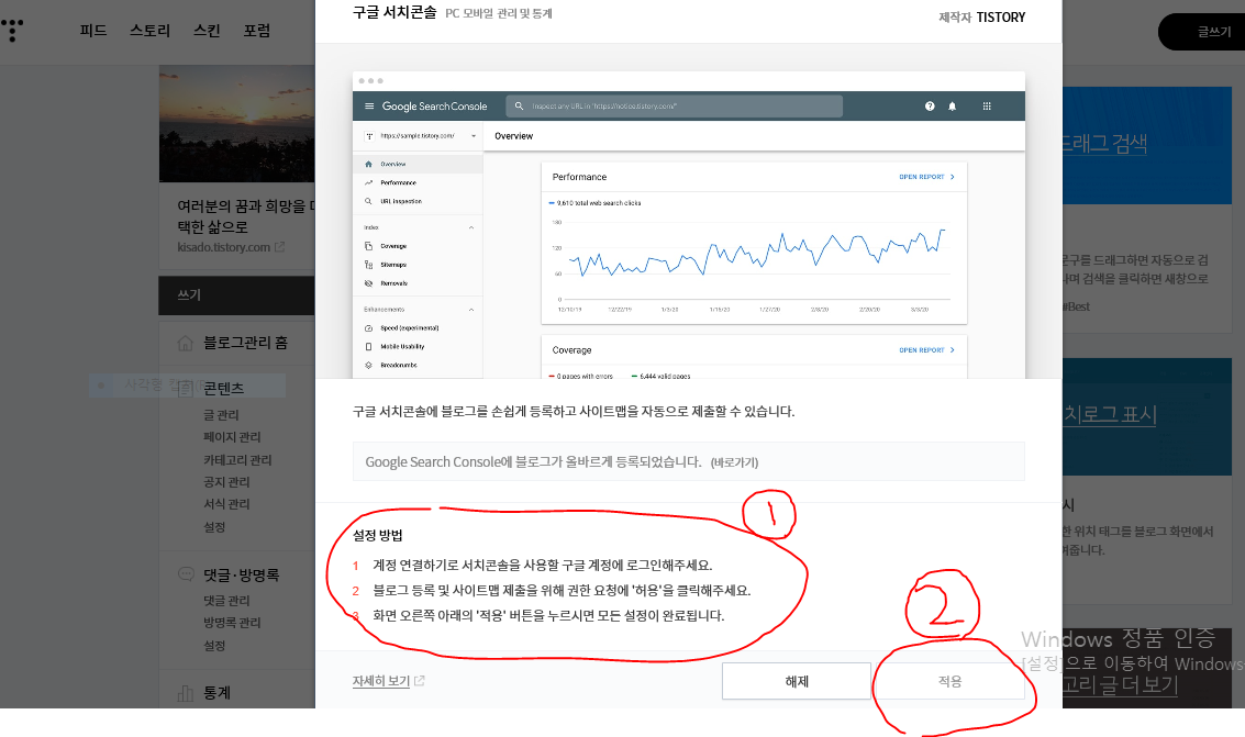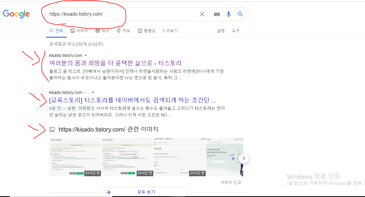 9. 아래 빨간색 동그라미에 제 티스토리 주소를 입력한 후 검색을 해보니, 화살표처럼 제 티스토리의 글들이 보이기 시작합니다.