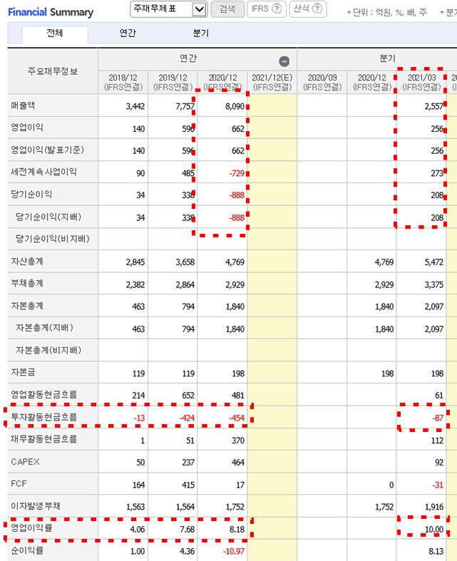 2021년 1분기 재무리포트를 보면 명신산업의 당기순이익이 큰 폭으로 증가한 것을 알 수 있으며, 투자활동현금흐름 또한 큰 폭으로 개선되었다는 것을 알 수 있습니다.