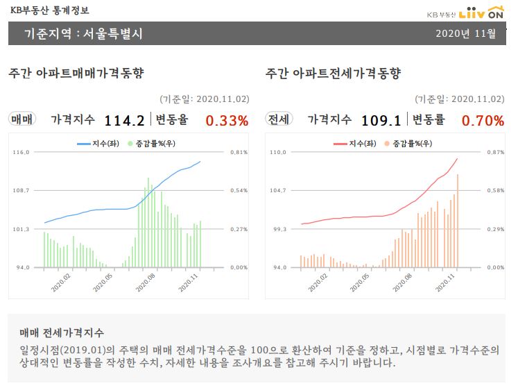1. 서울특별시 주간 아파트매매 가격지수는 전주보다 0.33% 상승하였으며, 주간 아파트전세 가격지수는 전주보다 0.70% 상승했습니다.