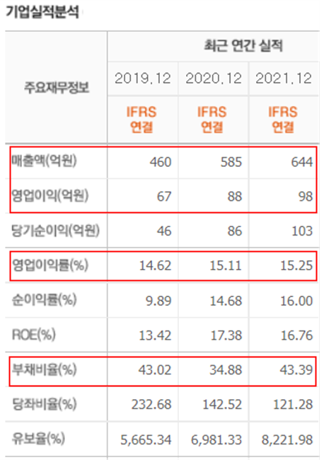 노터스는 매출액 및 영업이익이 꾸준히 증가하는 모습을 보여주고 있습니다. 또한 부채비율도 안정적인 모습을 보여주고 있습니다.