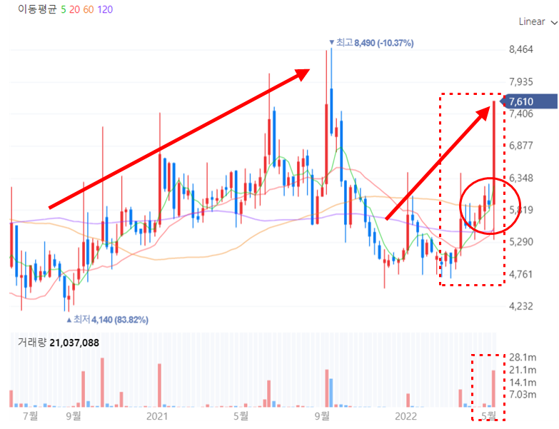 또한 5일 단기이평선이 60일 중기이평선 돌파를 눈앞에 두고 있으며, 20일 이평선 또한 120일 선 돌파를 눈앞에 두고 있는 모습입니다.