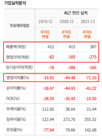 1) 매년 계속해서 적자를 기록하고 있으며, 더욱 큰 문제는 매출 및 영업이익 등이 계속해서 감소 추세라는 것입니다.