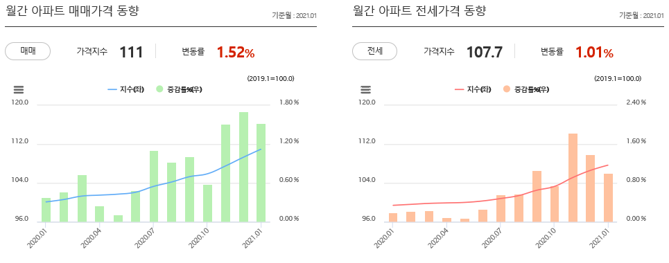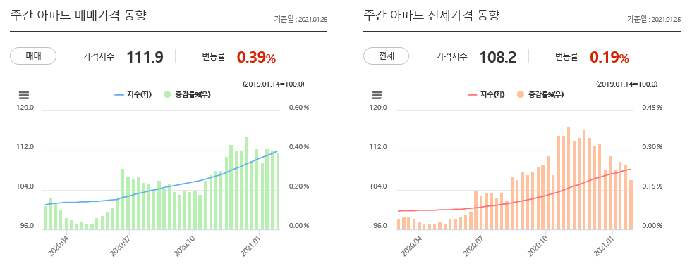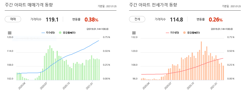 아래 KB부동산 매매 동향을 살펴보면, 올해도 부동산 가격 상승세는 연초부터 계속되고 있는 듯합니다.