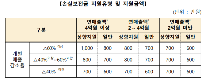 ☞ 개별업체 매출 규모 및 매출 감소율에 따라 700만 원, 800만 원 또는 1000만 원 지급