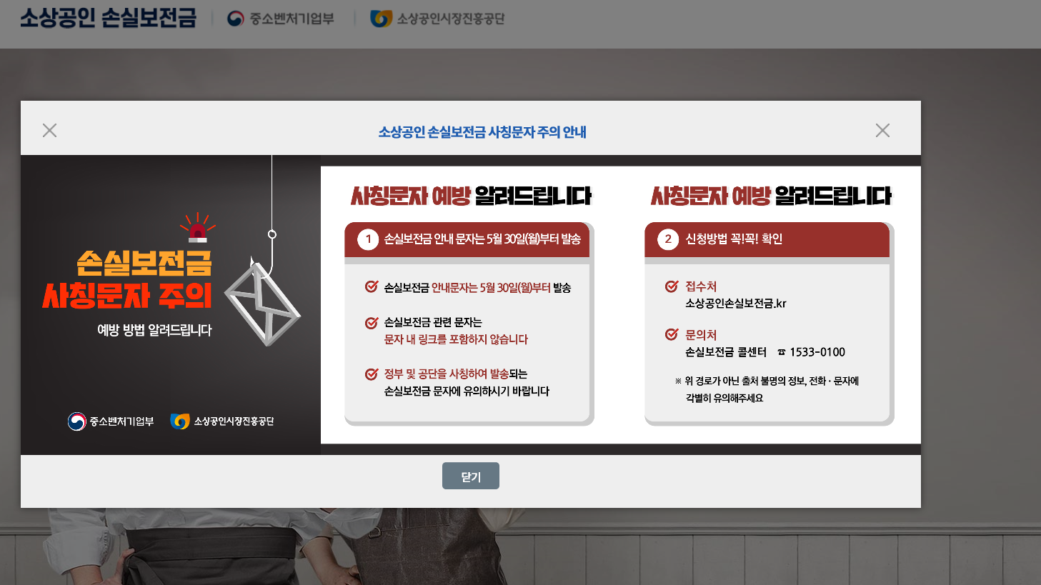 - 정부 및 공단을 사칭하여 발송되는 손실보전금 문자에 유의하시기 바랍니다.