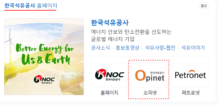 인터넷에서 오피넷을 검색하시거나 한국석유공사를 검색하시면, 아래와 같이 Opinet(오피넷) 이 검색되거나 한국석유공사 홈페이지가 나타납니다.