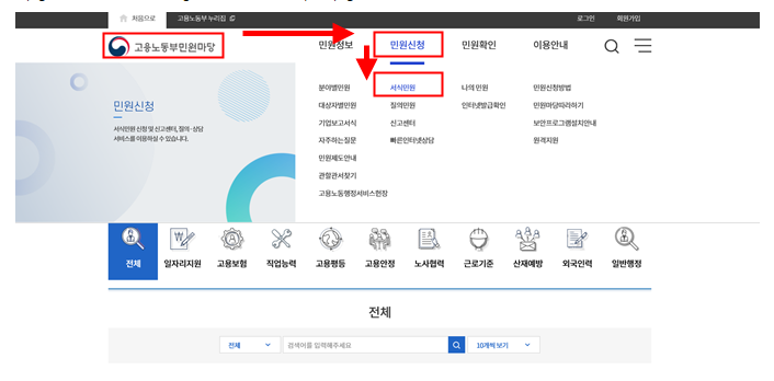 ☞ 고용노동부 홈페이지(www.moel.go.kr)에서 민원마당 클릭 →민원신청 클릭→서식민원에서 기타 진정신고서를 클릭→ *회원 가입 후 작성하거나 공인인증서 로그인 후 작성 및 신청